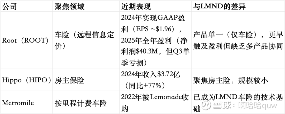 Root的路径值得关注。这家公司比Lemonade更早实现盈利(2024年),2025年全年也维持盈利(净利润$40.3M),但期间Q3单季出现亏损,说明insurtech的盈利稳定性仍需时间验证。Root的优势在于专注车险深耕定价模型,劣势在于产品单一,缺乏交叉销售能力。