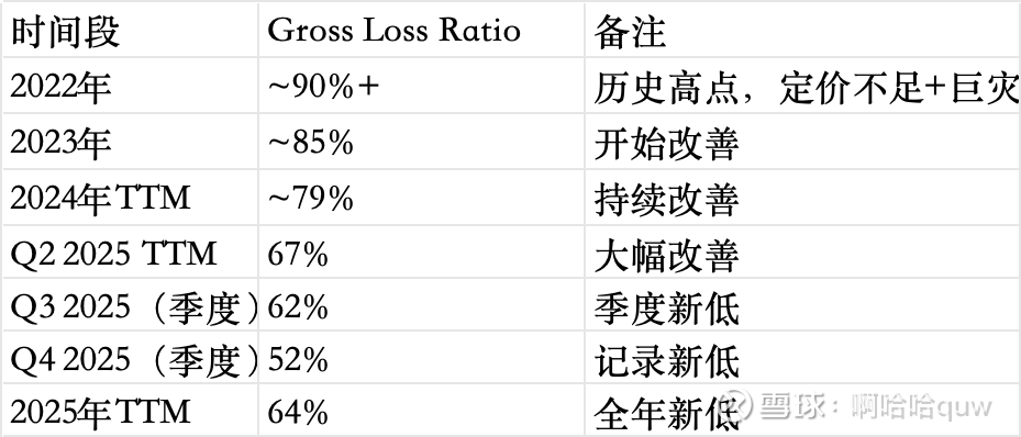 这三个AI系统共同构成了一个数据飞轮:更多客户产生更多数据,更多数据训练出更精准的风险定价模型,更好的定价带来更低的损失率,更低的损失率意味着更有竞争力的价格或更高的利润,进而吸引更多客户。这个飞轮的效果正在损失率数据中体现——TTM毛损失率从2022年的90%+持续降至2025年的64%。