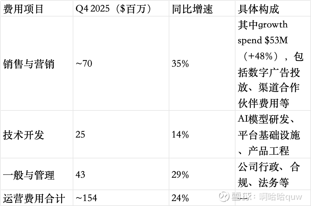 销售与营销费用是最大的运营支出项,其中growth spend(获客相关支出)$5,300万占大头,同比增长48%。Growth spend的高增速说明公司仍在积极获客——这不是一家在收缩投入换利润的公司,而是在增长投入加大的同时、因为收入增速更快而实现杠杆改善。LTV/CAC维持在3x以上,意味着每$1获客投入预期产生$3以上的客户终身价值。