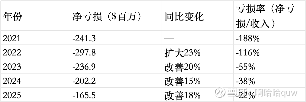 累计亏损(2021-2025)约$11.4亿。公司自成立以来从未实现GAAP盈利。但亏损率从-188%改善至-22%,趋势清晰。