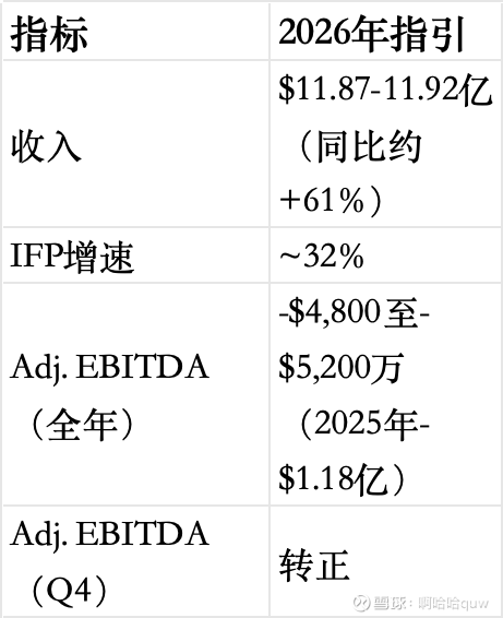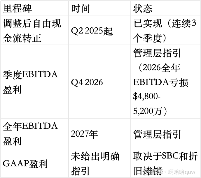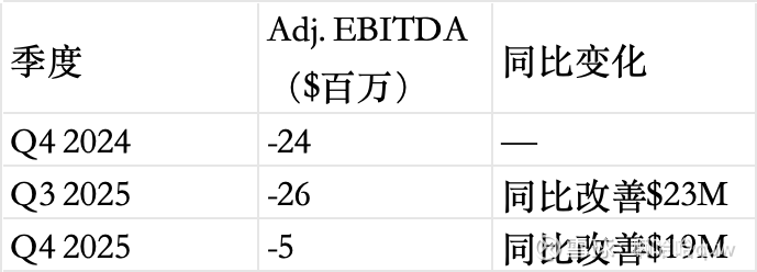 Q4 2025调整后EBITDA仅-$500万,距离转正一步之遥。管理层指引2026年全年调整后EBITDA亏损$4,800-5,200万(2025年为-$1.18亿),其中Q4 2026实现单季EBITDA盈利,2027年全年EBITDA盈利。