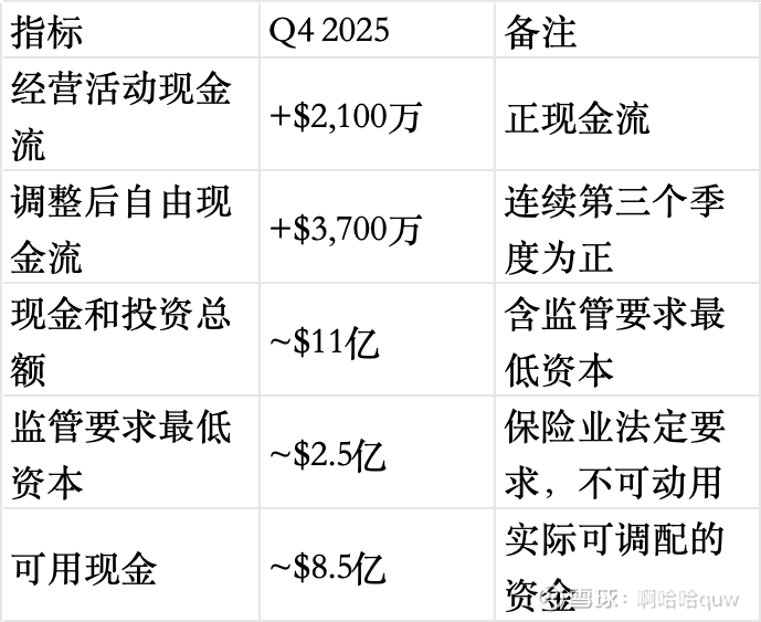 现金流的关键信号: 调整后自由现金流已连续三个季度为正,这比EBITDA更早发出盈利信号。$8.5亿可用现金按当前年净亏损约$1.65亿(且在收窄)计算,现金跑道超过5年。换言之,即使增长投入维持当前水平、盈利改善不如预期,Lemonade也没有短期资金压力。