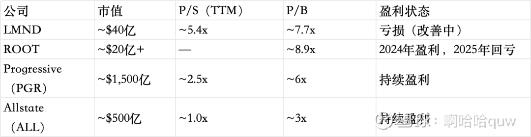与Root相比,LMND的P/B(7.7x)低于ROOT的8.9x,但LMND的产品线更多元化,收入规模更大。Root 2024年实现盈利后又在2025年回到亏损,说明insurtech的盈利能力尚未完全经受周期检验。