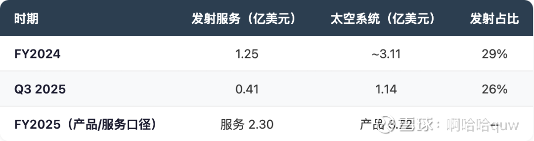 发射服务(Launch Services)——FY2024贡献收入约$1.25亿,占总收入约29%。核心产品是 Electron 小型运载火箭,提供专属轨道发射服务。FY2025财报按"服务收入"口径为$2.30亿(约占38%),但这一口径包含了部分太空系统中的服务类收入,不完全等同于发射服务分部。