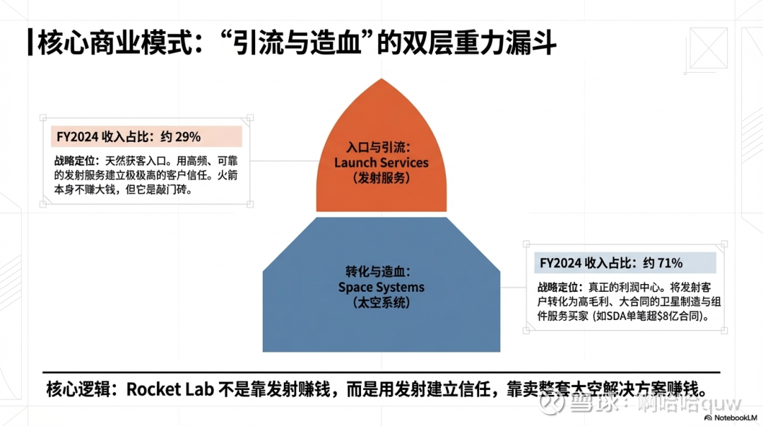 理解 Rocket Lab 的商业模式,关键在于两个字:引流。公司的核心逻辑不是"靠发射赚钱",而是"用发射建立信任,用太空系统赚钱"。每一次成功发射都是一次能力展示,把客户从"买一次发射服务"引导到"买整套太空解决方案"——从卫星组件、整星制造到发射再到在轨运营。发射服务只贡献约29%的收入,太空系统贡献约71%。