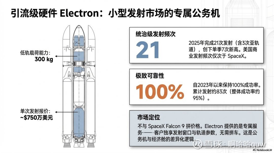 这个价格远高于SpaceX Falcon 9的拼车价(约5,000-6,000美元/公斤),但 Electron 卖的不是"便宜",而是"专属"——客户独享发射窗口、独享轨道参数,不用和别人拼车、不用迁就别人的时间表。这是公务机 vs 经济舱的逻辑。