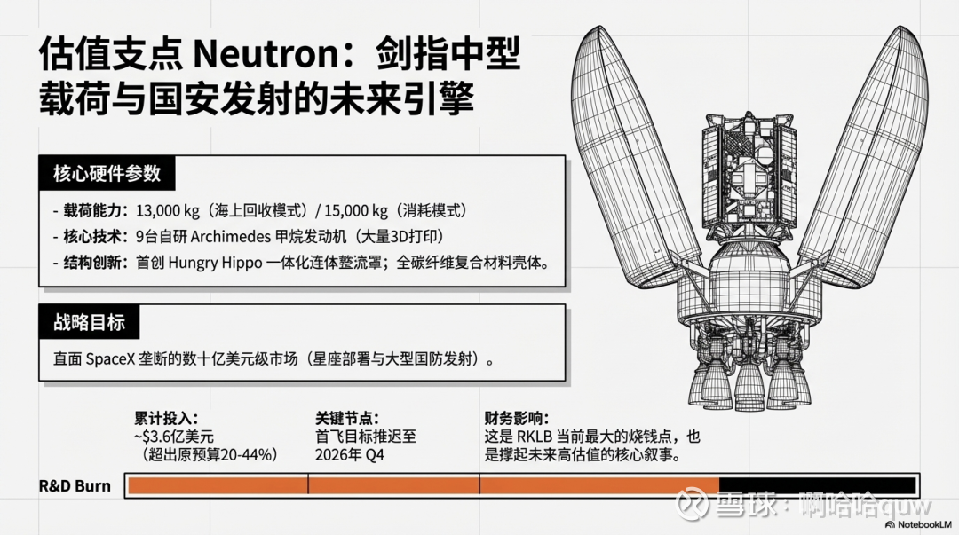 Neutron 已两次推迟首飞:原计划2024年底 → 推迟至2025年 → 2025年11月因一级储箱测试中出现制造缺陷再次推迟至2026年Q4。截至2025年底累计研发投入约$3.6亿,超出原预算($2.5-3亿)约20-44%。公司计划2026年发射3次 Neutron,2027年5次。