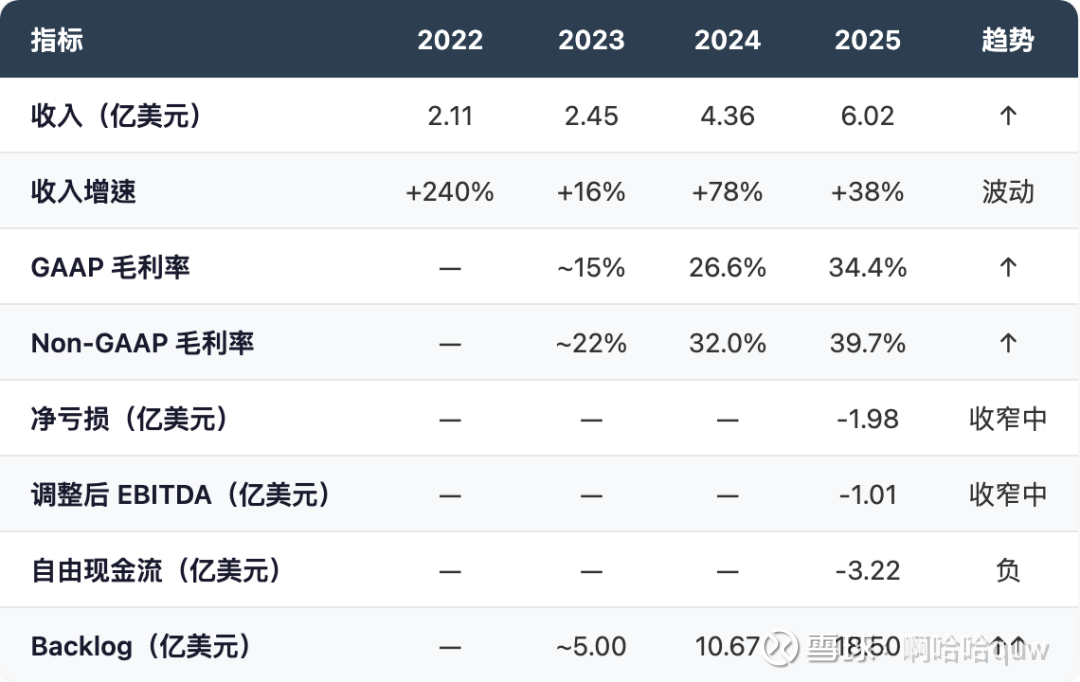 趋势上看,收入和毛利率在持续改善,Backlog 提供了较强的收入可见性。但自由现金流仍为负,盈利拐点尚需验证。