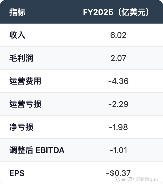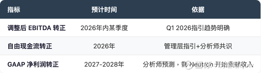 调整后 EBITDA 的改善趋势是最值得关注的信号。Q1 2026指引 EBITDA 亏损仅$-0.21至$-0.27亿,相比FY2025全年的$-1.01亿有明显收窄。管理层给出的盈利拐点预期: