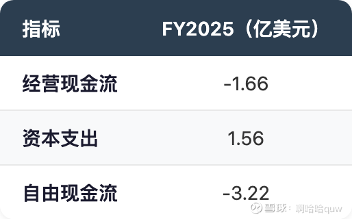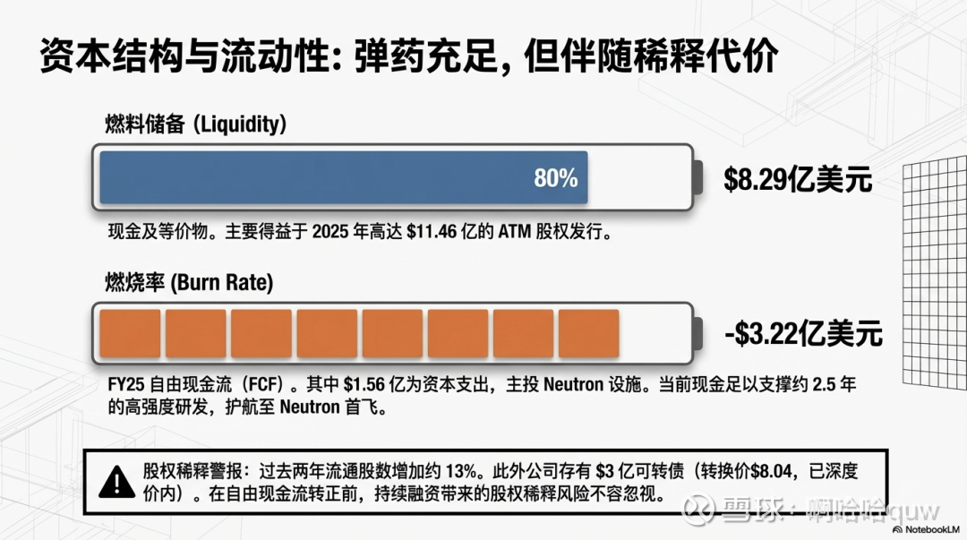 截至2025年底,现金及等价物$8.29亿。按FY2025自由现金流$-3.22亿的烧钱速度,当前现金储备大约可以支撑2.5年(假设烧钱速度不进一步恶化)。