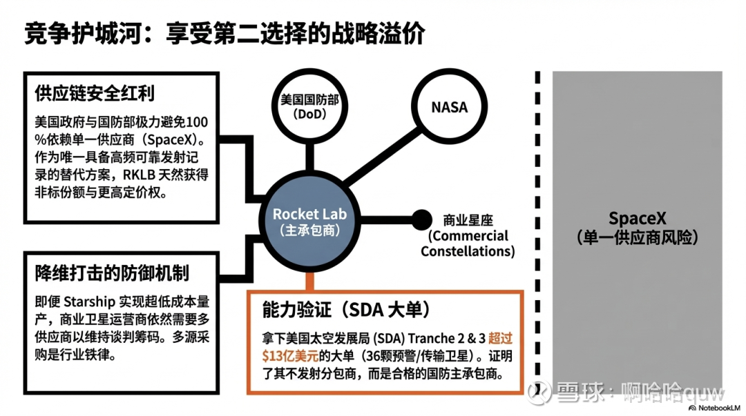 "第二选择"的战略溢价。 Rocket Lab 享有一种特殊的竞争地位:作为 SpaceX 之外唯一可靠的商业发射替代方案,公司天然获得了"战略溢价"。美国政府和国防部门不希望所有发射任务都依赖一家公司,这是出于供应链安全的考虑;商业卫星运营商也希望有多个发射供应商以获得谈判筹码。这种溢价体现在两个方面:一是定价能力——Electron 单位载荷成本远高于 Falcon 9 拼车价,但客户愿意为专属服务支付溢价;二是合同获取——政府客户在招标时倾向于给 SpaceX 之外的供应商留出份额。