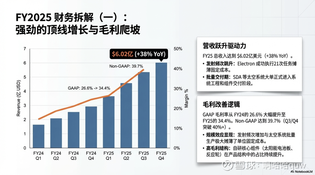 毛利率改善的驱动因素有三个:一是 Electron 发射频次提升摊薄了固定成本,发射越多、单次发射的固定成本分摊越低;二是太空系统业务规模效应开始显现,SDA 等大合同的批量生产降低了单位成本;三是高毛利组件产品(太阳能电池板、反应轮等)在收入中的占比提升。