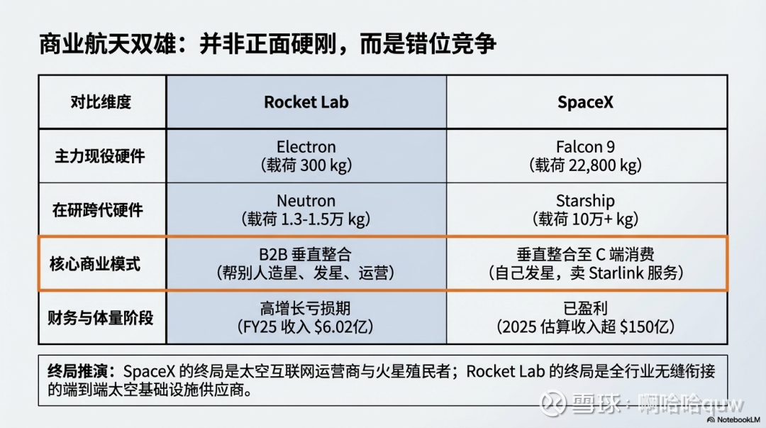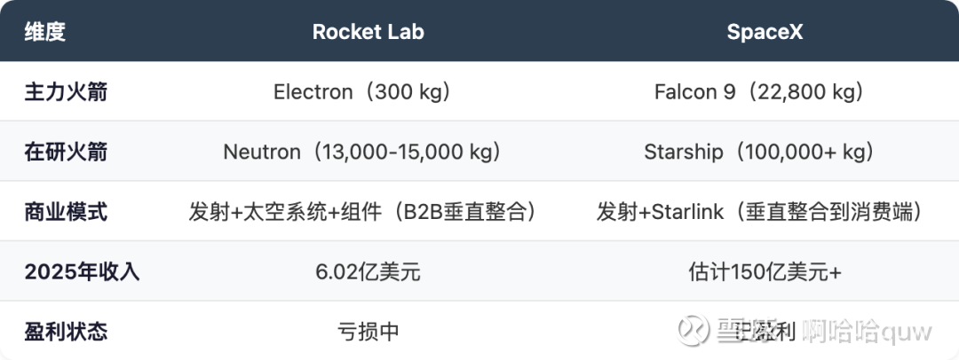 核心差异在于延伸方向:SpaceX 向下游延伸到了消费端(Starlink互联网服务),Rocket Lab 向上游延伸到了组件和卫星制造。SpaceX 是"自己造火箭、自己发卫星、自己卖服务",Rocket Lab 是"帮别人造卫星、帮别人发卫星、帮别人运营"。