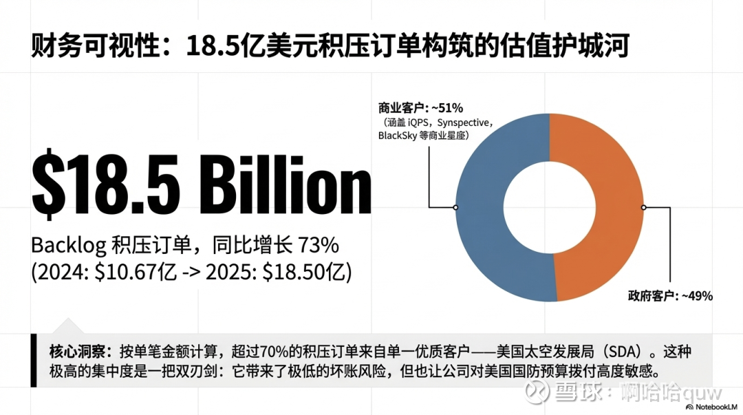 客户集中度方面,SDA 合同合计超过$13亿,占2025年底 Backlog($18.5亿)的约70%。虽然政府合同的信用风险较低,但对单一来源(SDA/美国太空军)的高度依赖是一个需要关注的集中度风险。