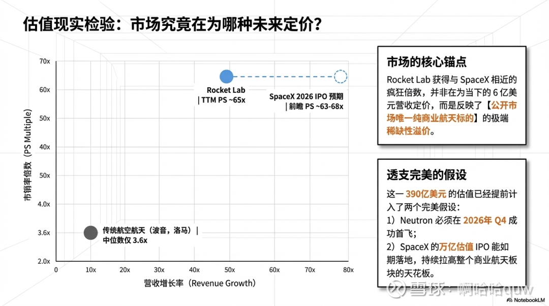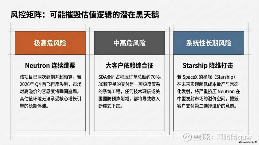 当前估值隐含的核心假设包括:Neutron 在2026年成功首飞并按计划量产、太空系统收入持续高增长(SDA 合同执行+新合同获取)、公司在2026-2027年实现盈利拐点、SpaceX IPO 可能重新锚定商业航天板块估值水平。这些假设中任何一个的变化,都会显著影响估值的合理性。