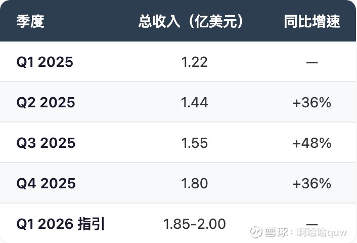 Q4 2025收入$1.80亿创季度新高,环比增长16%,同比增长36%。Q1 2026指引$1.85-2.00亿,环比继续增长。