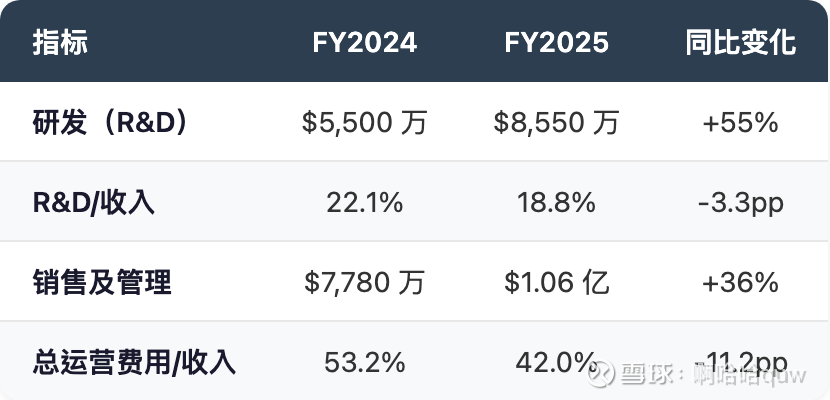R&D 支出增长 55%($3,050 万),主要投向 800G/1.6T 光模块和 CATV 新产品开发。占收入比从 22% 降至 19%,运营杠杆开始体现。总运营费用占收入比从 53% 降至 42%,但绝对值仍在快速增长。