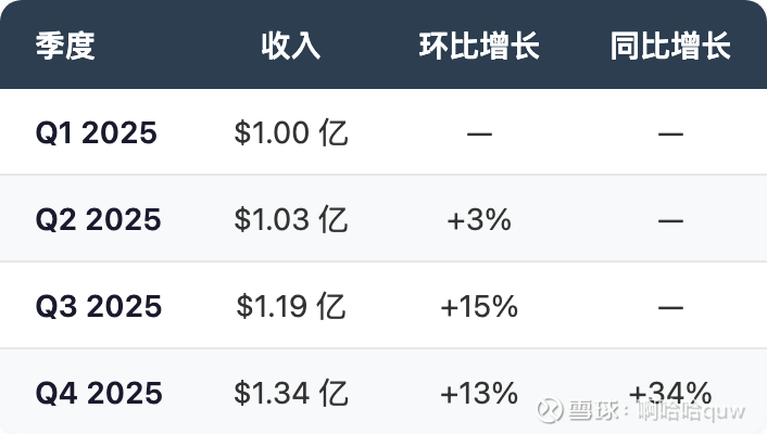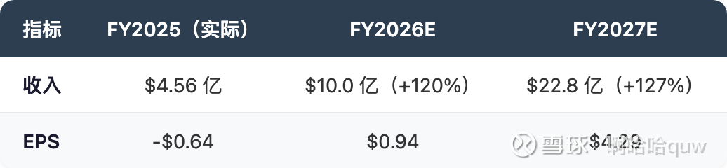 管理层给出的 Q1 2026 收入指引为 $1.5-1.65 亿(中值 $1.575 亿),环比继续增长约 17%。全年收入目标超 $10 亿,隐含增速超 120%。