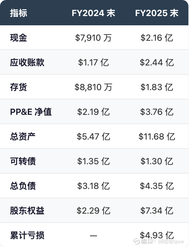 FY2025 末总资产 $11.68 亿,较 FY2024 翻倍(+114%),增长主要来自现金(+$1.37 亿,来自股权融资)、应收账款、存货和 PP&E。