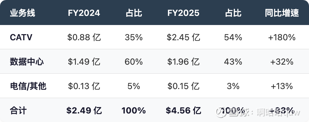 Q4 2025 数据中心收入约 $7,500 万(同比 +69%,环比 +70%),是增速最快的季度。400G 产品同比增长 141%,800G 开始小批量贡献。CATV 收入约 $5,400 万(环比 -24%),显示 CATV 可能已过阶段性高点。