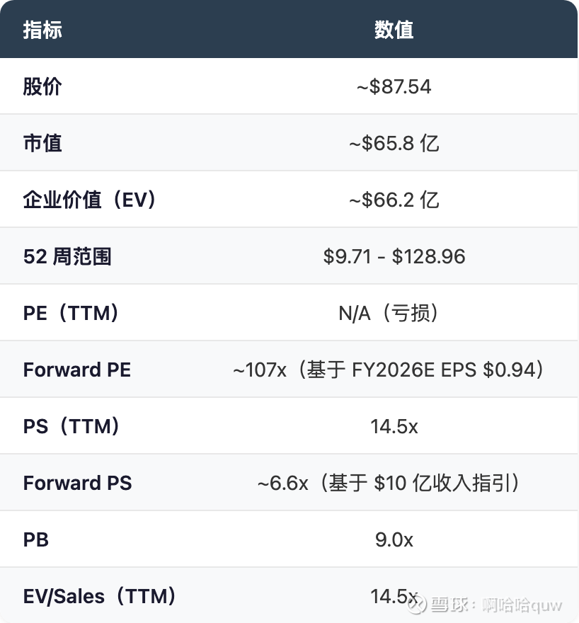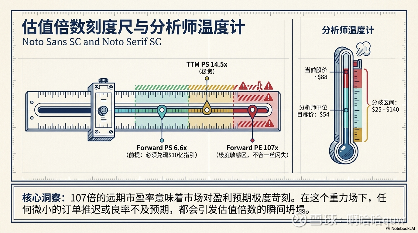 当前估值的参考坐标取决于投资者看哪个时间窗口。TTM PS 14.5x 看起来很贵,但如果用管理层指引的 FY2026 $10 亿+ 收入计算,Forward PS 降至 ~6.6x。Forward PE 107x 极高,但这是因为公司刚从亏损转向微利,盈利基数极低——分析师预期 FY2026 EPS 仅 $0.94。
