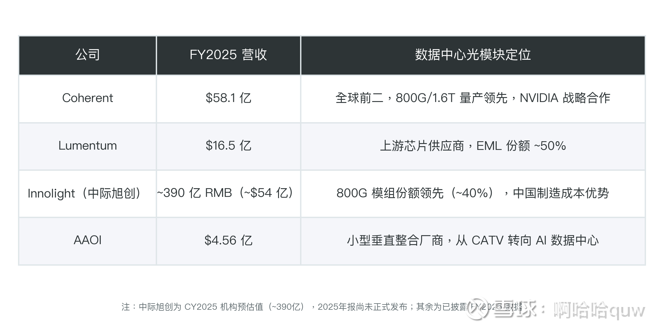 AAOI 不是与Coherent/Lumentum 直接对标的公司——体量差距太大。更准确的定位是"小型垂直整合光模块厂商,正在从CATV 转向 AI 数据中心"。Amazon 长约改变了竞争格局,如果执行顺利,AAOI有可能在 800G/1.6T 市场中获得 5%+ 的份额,但这需要产能和技术的同步兑现。