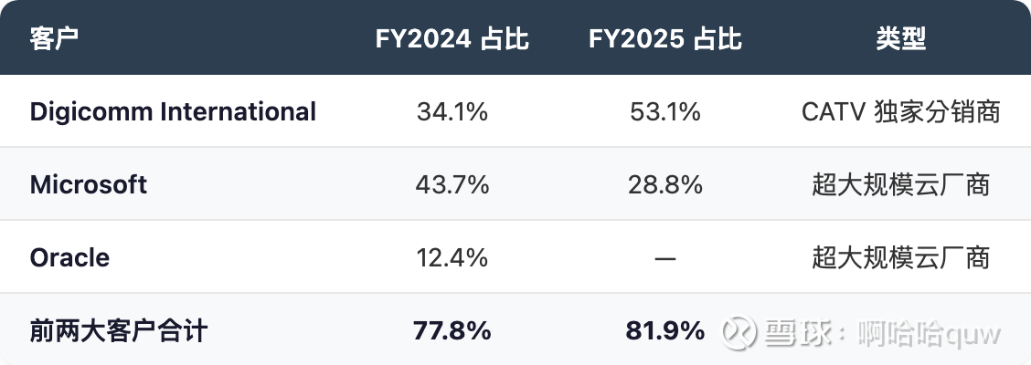 Amazon $40 亿长约提供了 10 年需求可见性,Microsoft 是 FY2025 最大数据中心客户(28.8%),CATV 通过 Digicomm 独家分销实现渠道锁定。但客户绑定的另一面是极端的客户集中度——前两大客户占收入 82%,任何一个大客户的流失都会造成重大冲击。