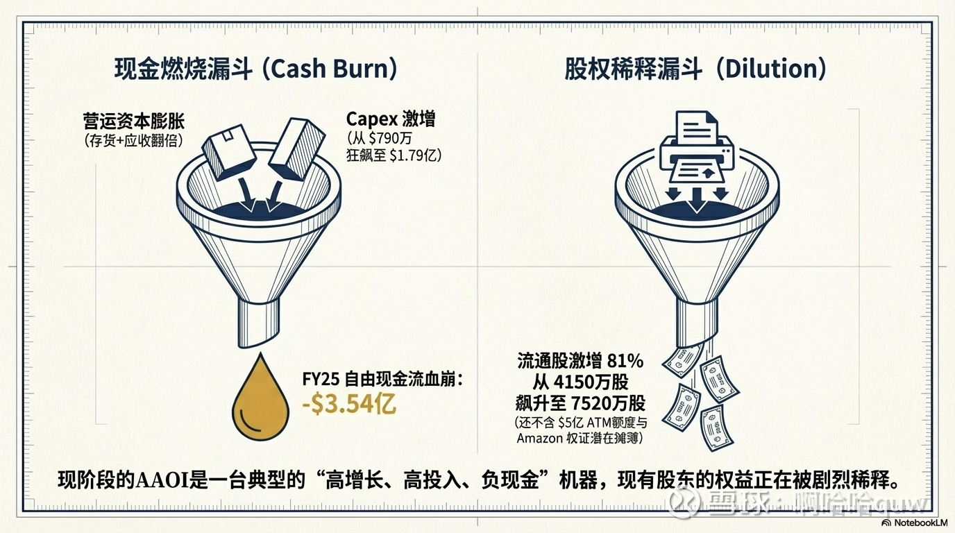 FY2025 自由现金流 -$3.54 亿,经营现金流 -$1.74 亿。即便 FY2026 收入翻倍,大规模 Capex(预计 $3 亿+)可能使自由现金流继续为负。公司依赖 ATM 股权融资维持运营——ATM 额度已从 $2.5 亿扩大至 $5 亿。FY2024-FY2025 流通股数从约 4,150 万增至 7,520 万(+81%),加上 Amazon 认股权证和可转债转换的潜在稀释,现有股东的权益正在被持续摊薄。