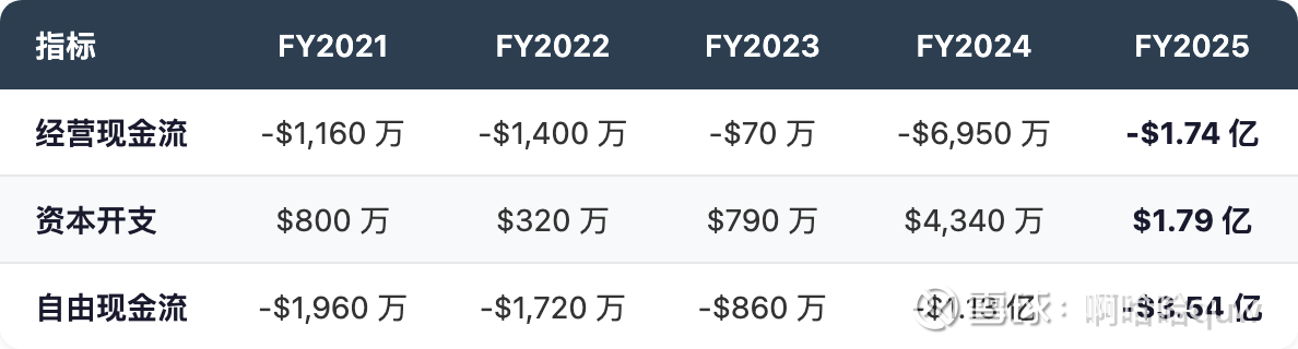 AAOI 在过去 5 年中从未产生正的经营现金流或自由现金流。FY2025 自由现金流 -$3.54 亿,是一个需要认真对待的数字。