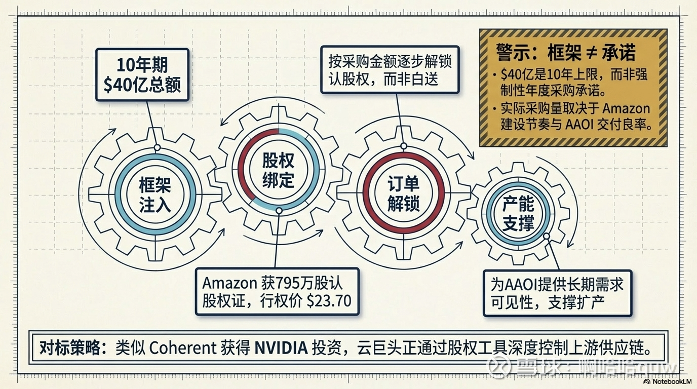 2025 年 3 月 13 日,AAOI 与 Amazon 签署交易协议:Amazon 获得认股权证,可购买最多 795 万股 AAOI 普通股,行权价 $23.70/股,其中 132 万股在签署日立即授予,其余根据采购金额逐步解锁。框架总额 $40 亿,期限 10 年。