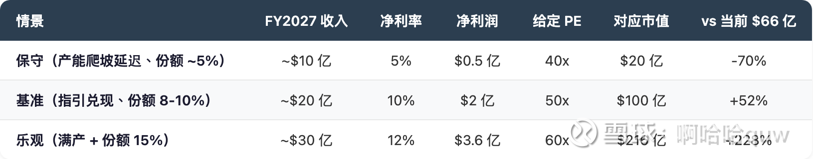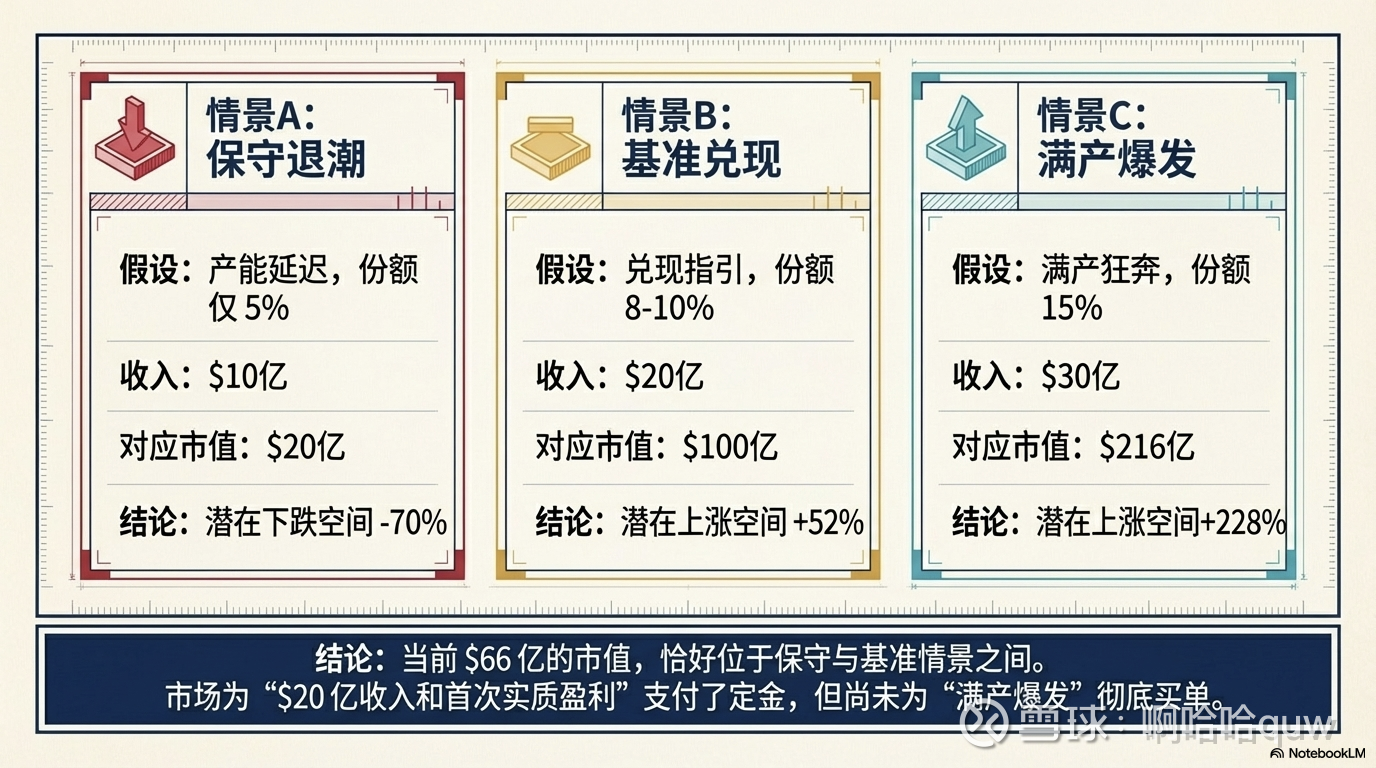 当前 $66 亿市值大致对应基准情景的折价水平——市场已经为 FY2027 $20 亿级别收入和首次实质盈利买了单,但尚未完全 price in 满产和高份额的乐观情景。保守情景下的回调空间约 70%,这是高增长 + 高不确定性标的的典型特征。