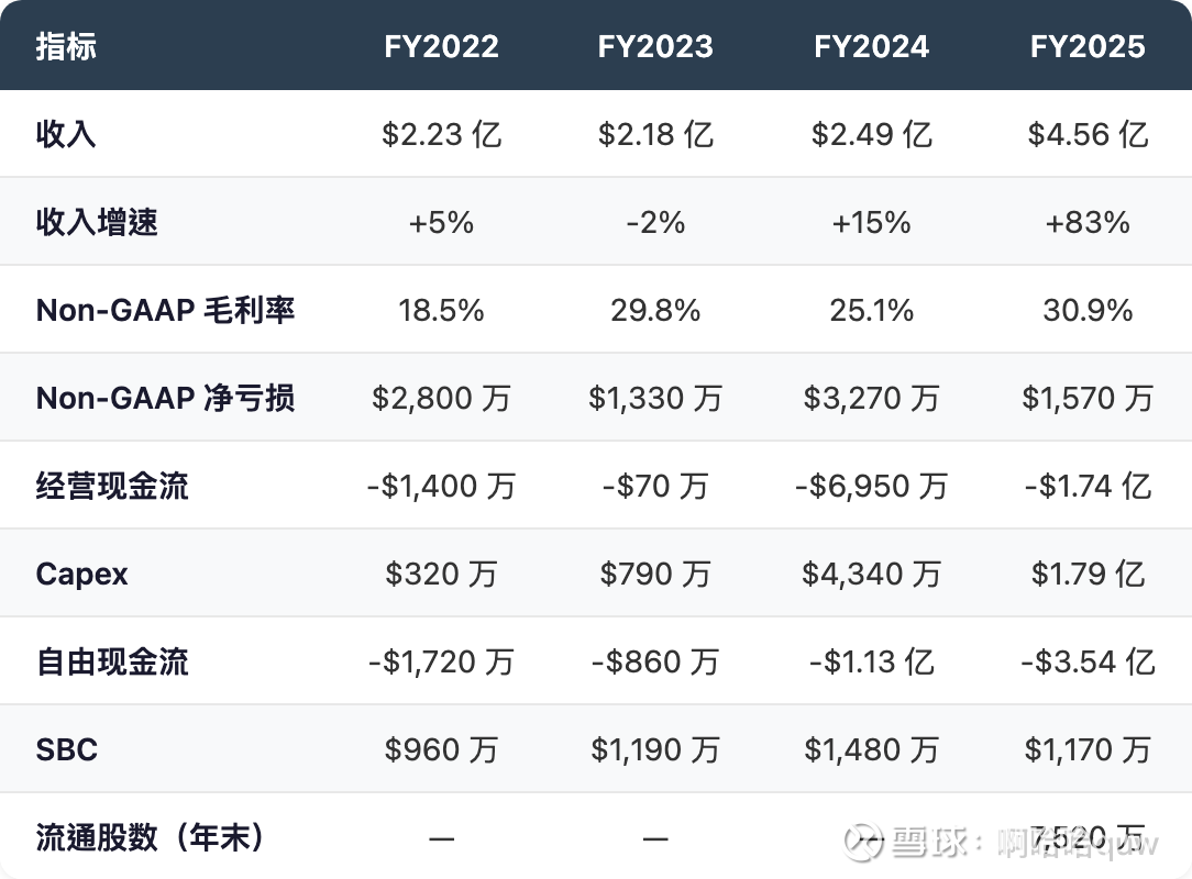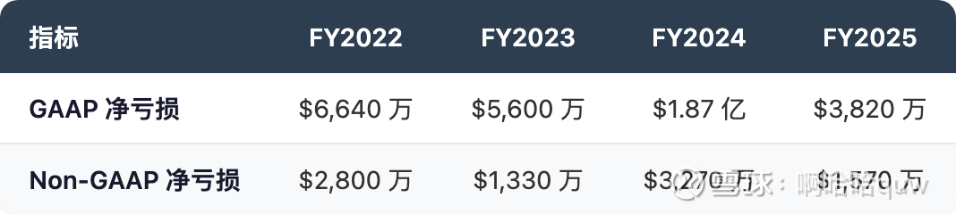 FY2024 GAAP 净亏损高达 $1.87 亿,远大于 Non-GAAP 的 $3,270 万,差异主要来自年末可转债交换产生的约 $1.34 亿一次性非现金损失。FY2025 亏损大幅收窄,Q4 2025 Non-GAAP 净亏损仅 $60 万,接近盈亏平衡。管理层预计 2026 年 Q2 实现持续 Non-GAAP 盈利。