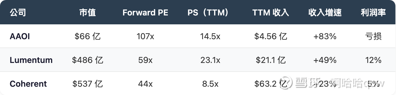 AAOI 的收入增速(83%)在三家中最高,但规模最小、利润率最低。Lumentum 和 Coherent 都已实现稳定盈利,且体量远大于 AAOI——这意味着市场对已证明盈利能力的光模块公司给予更高的估值溢价。