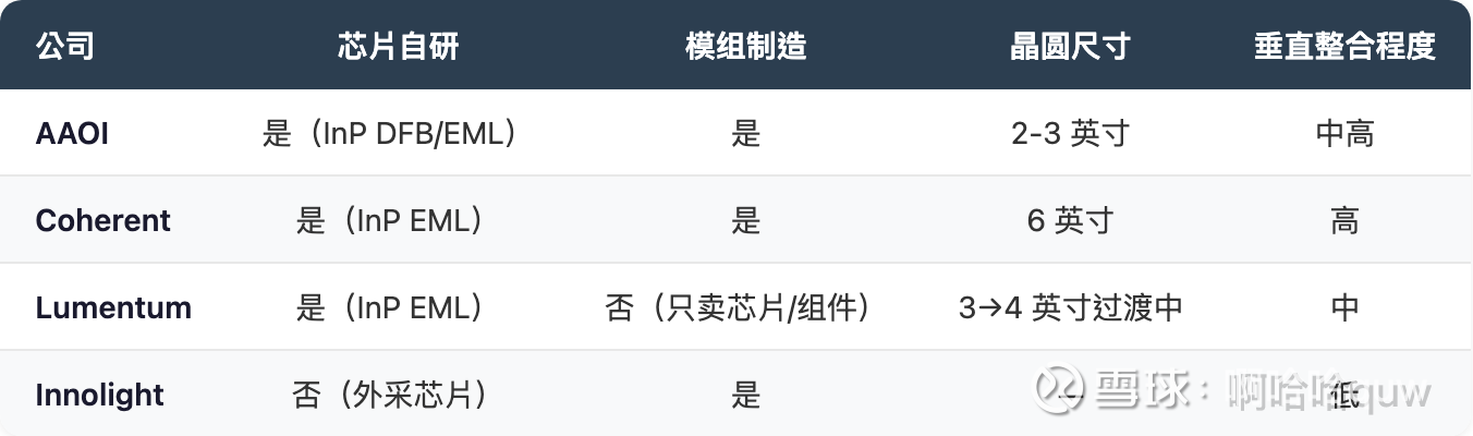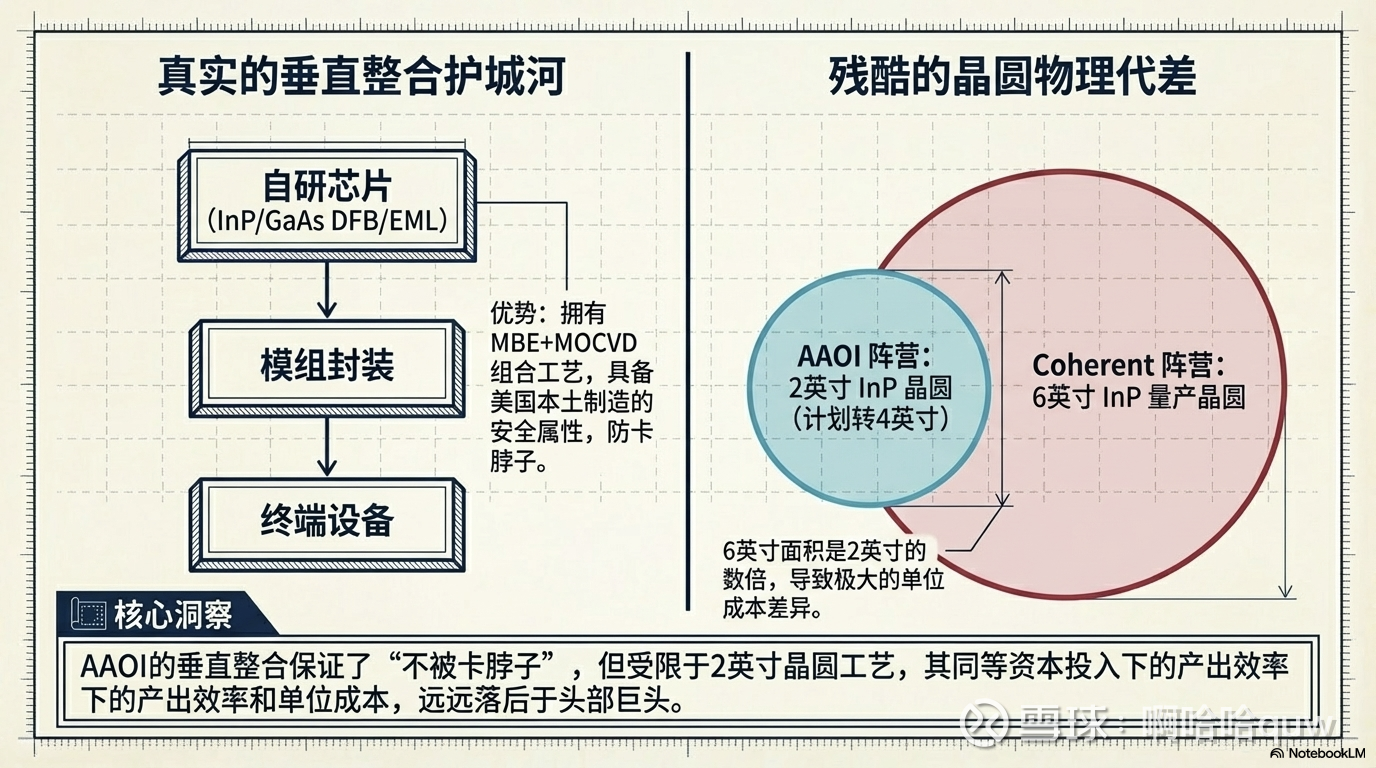AAOI 的激光芯片仍在 2 英寸晶圆上生产(计划 2026 年底到 4 英寸),而 Coherent 已在 6 英寸上量产。6 英寸晶圆的产出面积约为 4 英寸的 4 倍,这意味着 Coherent 在同等资本投入下的单位成本远低于 AAOI。AAOI 的垂直整合是真实的——不依赖外部芯片供应,在 InP 产能紧张时有保障——但规模和效率与行业头部玩家存在代差。