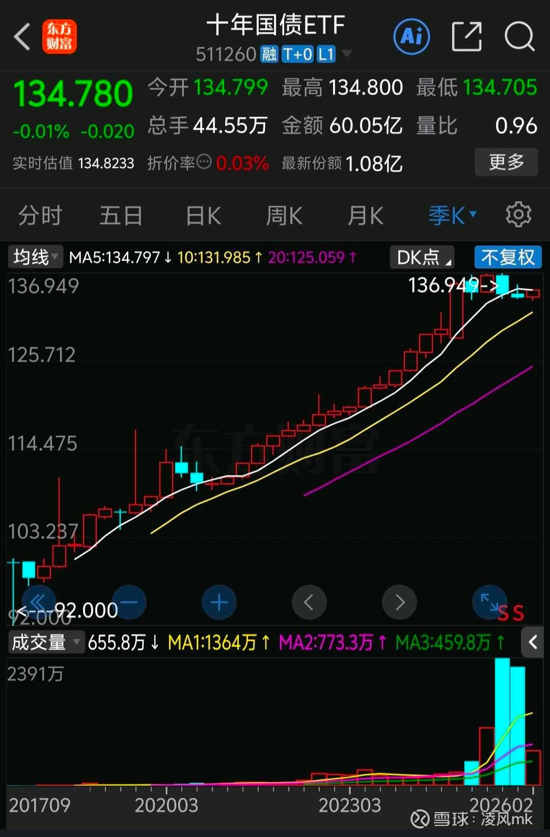 2018年1月份第一个交易日十年期国债ETF价格是99. 93,为了方便计算直接用100来代替,八年后2026年2月5号,十年期国债ETF的价格是134.9,过去八年多,它的总收益约34.9%。