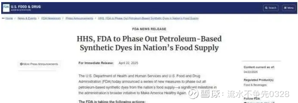 1、美国FDA于今年4月份宣布将在2026年年底前从美国食品供应链中逐步淘汰包括“诱惑红”“柑橘红”“柠檬黄”“日落黄”等8种合成色素。