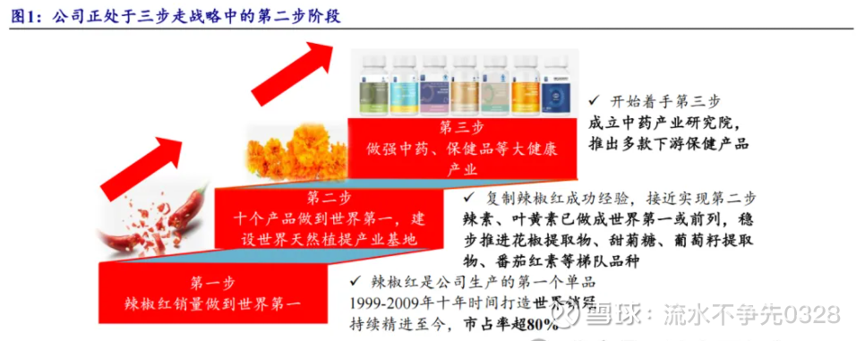 第二步,正在进行推动十个拳头产品做到世界第一,建设世界天然植提产业基地。目前辣椒红素、辣椒精、叶黄素三大主力产品市占率已世界第一,正稳步推进番茄红素、姜黄素、甜菊糖、葡萄籽提取物、花椒油提取物等梯队产品的继续扩张。