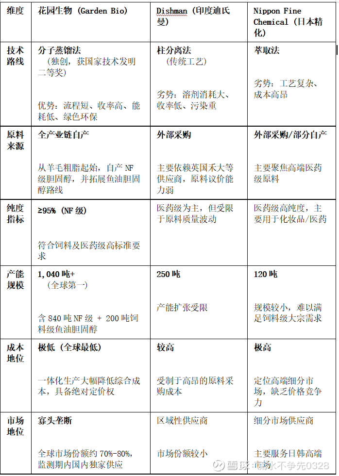 技术与成本多维对比:花园生物凭借独创的“分子蒸馏法”工艺,在全球胆固醇市场建立了极高的技术与成本壁垒,与国际竞争对手形成了显著的代际优势。以下是花园生物与主要国际竞争对手(Dishman、Nippon Fine Chemical)在技术路线、产能及成本等维度的详细对比: