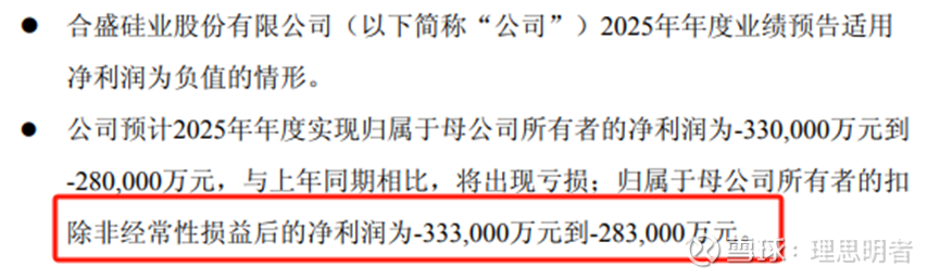 周五晚上合盛硅业发了2025年的业绩预告,全年扣非亏损28.3~33.3亿元,中值大概是亏损30.8亿元,其中包含减值的11-13亿元,中值是12亿元,扣除资产减值的12亿元,亏损中值在18.8亿元。而2025年前三季度,扣非是亏损2.71亿元,资产减值2.13亿元,则抛开资产减值是亏损0.58亿元,基于全年的预告情况,则Q4亏损约为18亿元。