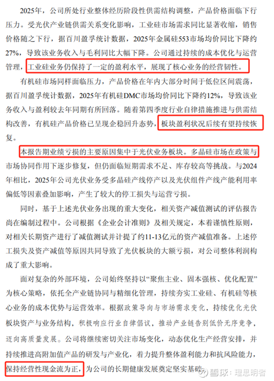 如果我们细看公司预告的解释,整体亏损是受到光伏业务拖累,而工业硅和有机硅的表现还在持续恢复,和我之前想的一样,但光伏这块的亏损确实超预期了。而当时看好最大理由是公告提到的最后一点,公司的现金流能力。