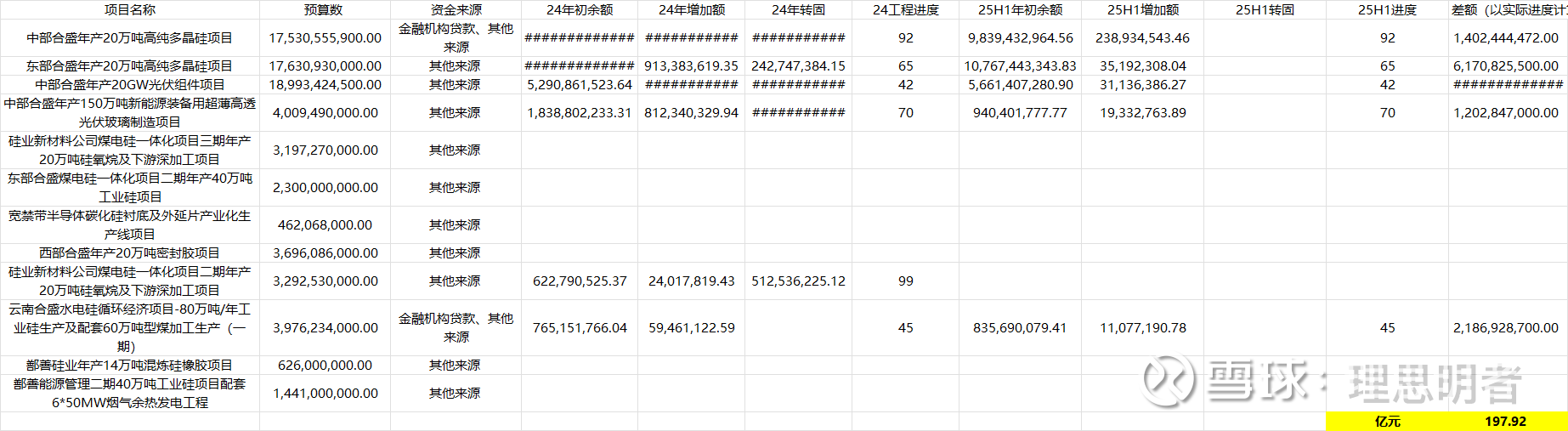 我整理了下公司22年初到25H1的在建工程情况,截至25H1,公司在建工程约为352亿元,大头主要是4个项目中部合盛年产20万吨高纯多晶硅项目(25H1余额 98亿,下同)、东部合盛年产20万吨高纯多晶硅项目(108亿)、中部合盛年产20GW光伏组件项目(57亿)、中部合盛年产150万吨新能源装备用超薄高透光伏玻璃制造项目(9.4亿)。特点是清一色的光伏相关项目,另外,从25年开始这些项目进度也基本停滞,如果按照预算额和工程进度来算,这些项目完工还需要200亿。