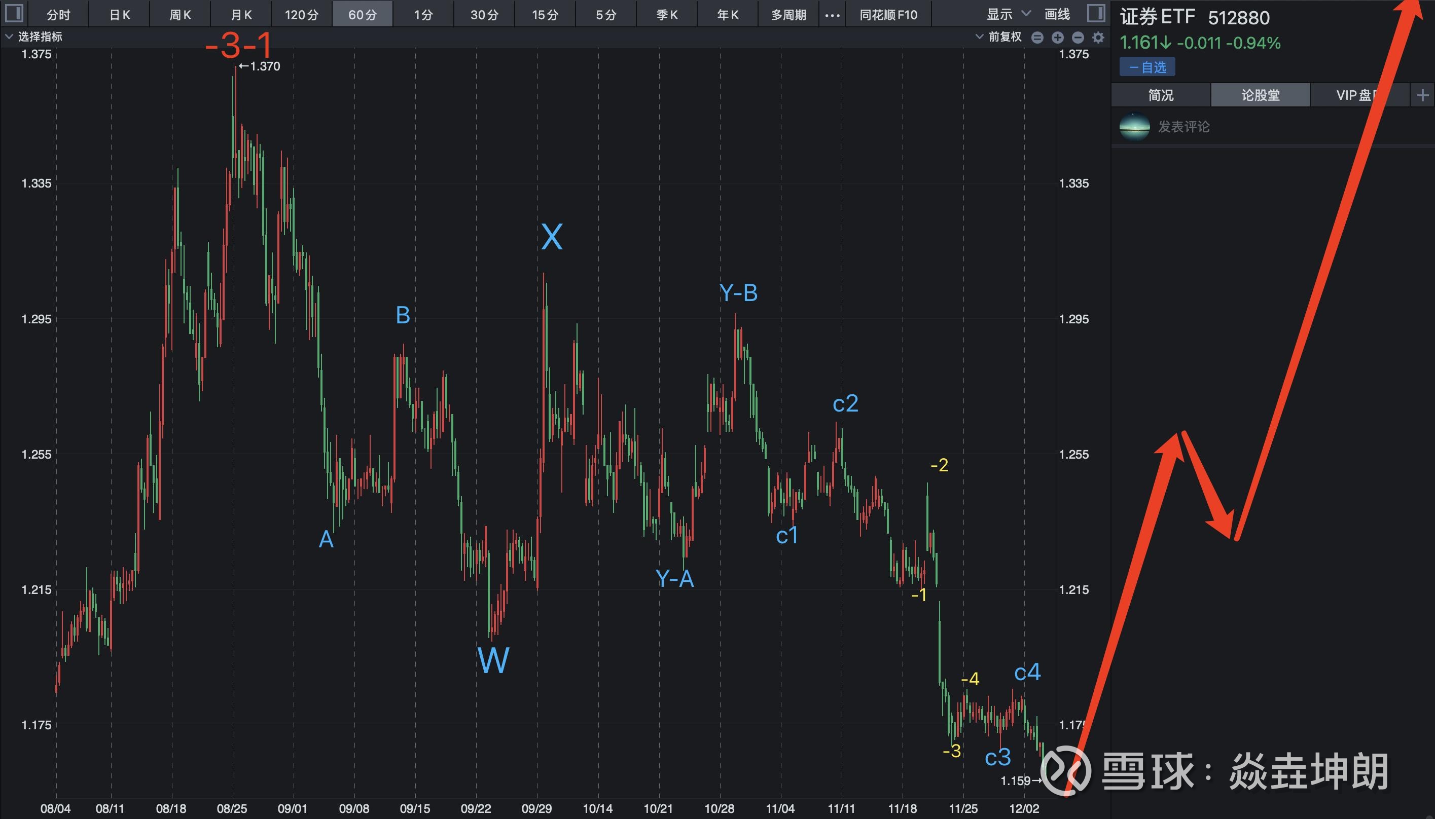 当前券商的浪形在细浪级别有所修正,如上图,-3-2仍然是走的之前说的那样复杂的联合调整浪WXY,进行修正的细浪是Y-C浪,前面11.21的急跌C5修正为C3-3,本月1号才开始的C5,到今天是第三天了,理论上会持续到本周五,但也随时会出现一根反转大阳提前终结C5,终结Y-C,终结-3-2,所以这个时候除了坚定持有,别无他法!因为一旦拉一根大阳,可以直接拉到C2的位置,把那些割肉的,以及观望着等更低点的直接甩下车!$证券(BK0057)$ $东兴证券(SH601198)$ $中金公司(SH601995)$
