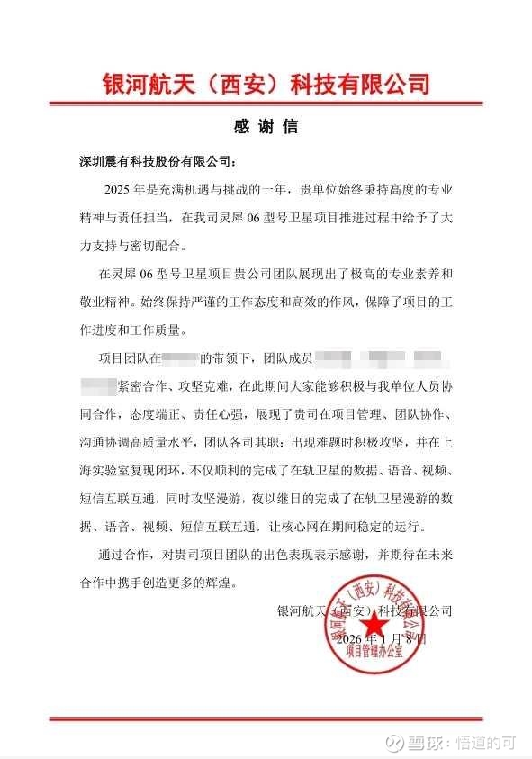 昨晚震有迎来重磅催化:公开银河航天已经有成熟的合作,银河航天向震有科技发感谢信。