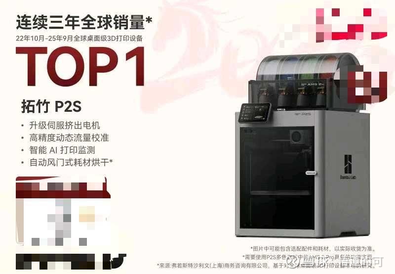 拓竹科技连续3年占据全球消费级3D打印机销量第一。