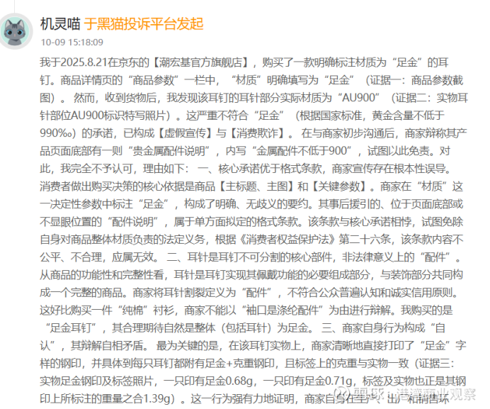 10月9日,有消费者投诉称,自己8月21日在京东潮宏基官方旗舰店购买的明确标注材质为“足金”的耳钉,在收到货物后,发现该耳钉的耳针部分实际材质为“AU900”,这严重不符合“足金”(根据国家标准,黄金含量不低于99%)的承诺,已构成虚假宣传与消费欺诈。在与商家初步沟通后,商家辩称其产品页面底部有一则“贵金属配件说明”,内写“金属配件不低于900”,试图以此免责。