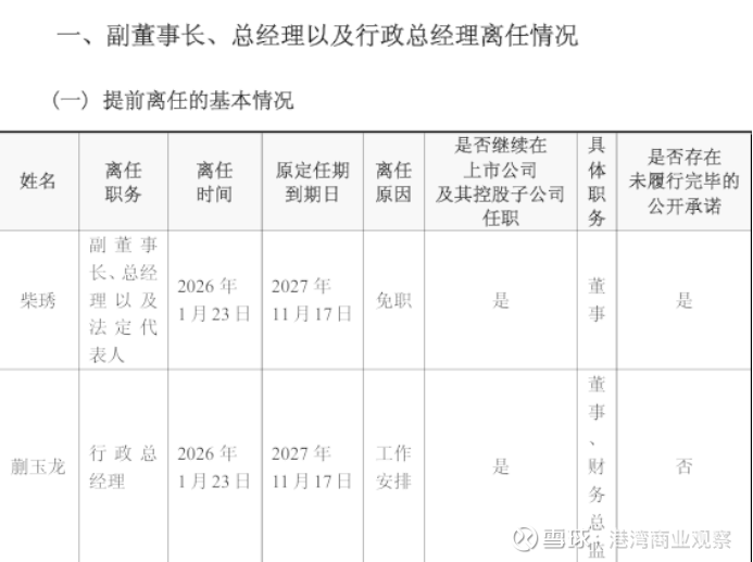 公告显示,公司副董事长、总经理以及法定代表人柴琇、行政总经理蒯玉龙都于2026年1月23日离职,两任不同的是,柴琇离任原因是免职,而蒯玉龙离任原因是工作安排,两人原定任期都为2027年11月17日。