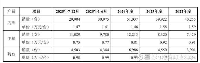 下游方面,数控机床行业竞争加剧导致客户产品价格下降。招股书显示,报告期内公司主要产品售价均呈下降趋势。刀库产品售价从2022年的1.59万元/台降至2025年1-6月的1.41万元/台,主轴产品从0.91万元/支降至0.77万元/支,转台产品从1.14万元/台降至0.99万元/台,价格下行趋势贯穿报告期始终。