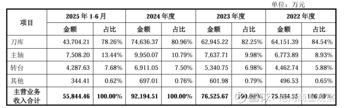 公司报告期内主营业务收入来自刀库产品,收入占比在80%左右。报告期内,冈田智能主营业务收入分别为7.59亿元、7.65亿元、9.22亿元、5.58亿元。其中,刀库的收入分别为6.42亿元、6.29亿元、7.46亿元、4.37亿元,占主营业务收入的比例分别为84.54%、82.25%、80.96%、78.26%。