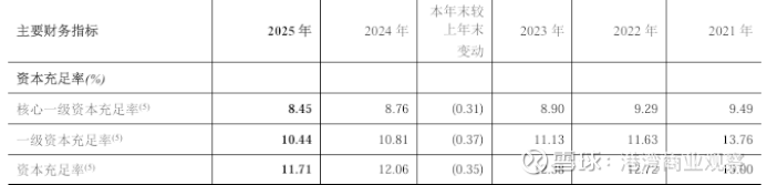 2025年,该行资本充足率、一级资本充足率、核心一级资本充足率分别为11.71%、10.44%、8.45%。2024年,该行资本充足率、一级资本充足率、核心一级资本充足率分别为12.06%、10.81%、8.76%。