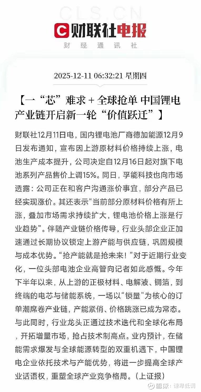二三线电池厂也开始涨价了。全产业链,戴维森双击,供不应求。国内电池厂商,德加能源发布通知,自12月16日起,对旗下电池产品售价上调15%。孚能科技也向市场透露,正在与客户沟通涨价,部分产品已经提价。两大厂商不约而同的动作,标志着锂电池行业的涨价潮,正从上游原材料,向下游电芯和系统传导。$宁德时代(SZ300750)$ $亿纬锂能(SZ300014)$ $欣旺达(SZ300207)$ 上证指数,创业板指,深证成指